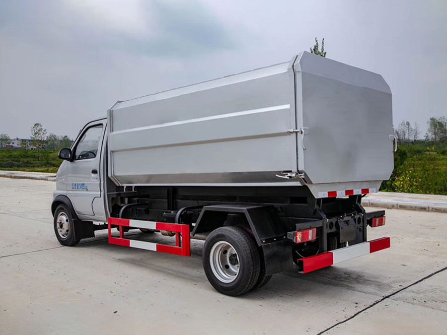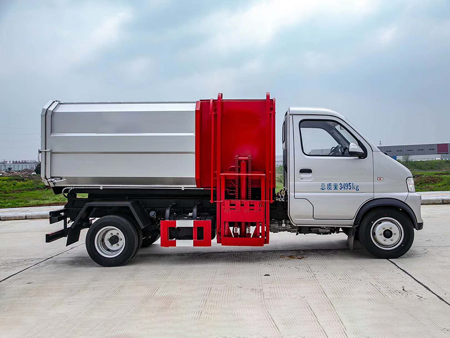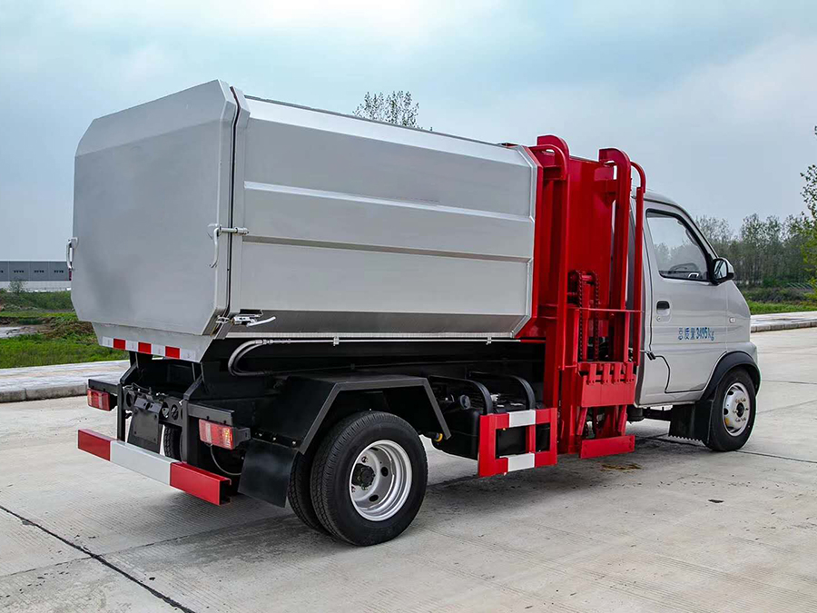 上裝配置:箱體采用邊三底三碳鋼板制作,箱體前部側(cè)面帶有掛桶提升機(jī)構(gòu),可自動(dòng)舉升垃圾桶倒入垃圾,120/240L塑料桶通用,提升機(jī)頂部自動(dòng)翻蓋,帶有手動(dòng)油門,提高作業(yè)效率,箱體底部雙液壓缸舉升自卸,箱體尾部設(shè)有擋水槽防止污水外泄,尾門裝有橡膠密封條,防止二次污染。。