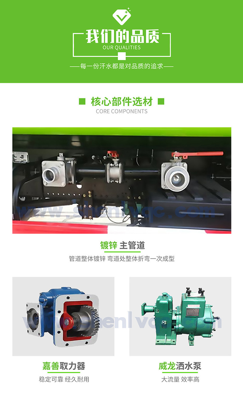 1、大鴨嘴前沖噴頭,萬向前沖球閥;2、選裝氣動球閥駕駛室內(nèi)控制;3、選裝自動灑水炮;4、選裝LED箭頭燈,長條警燈;5、選裝食品級304不銹鋼罐體;