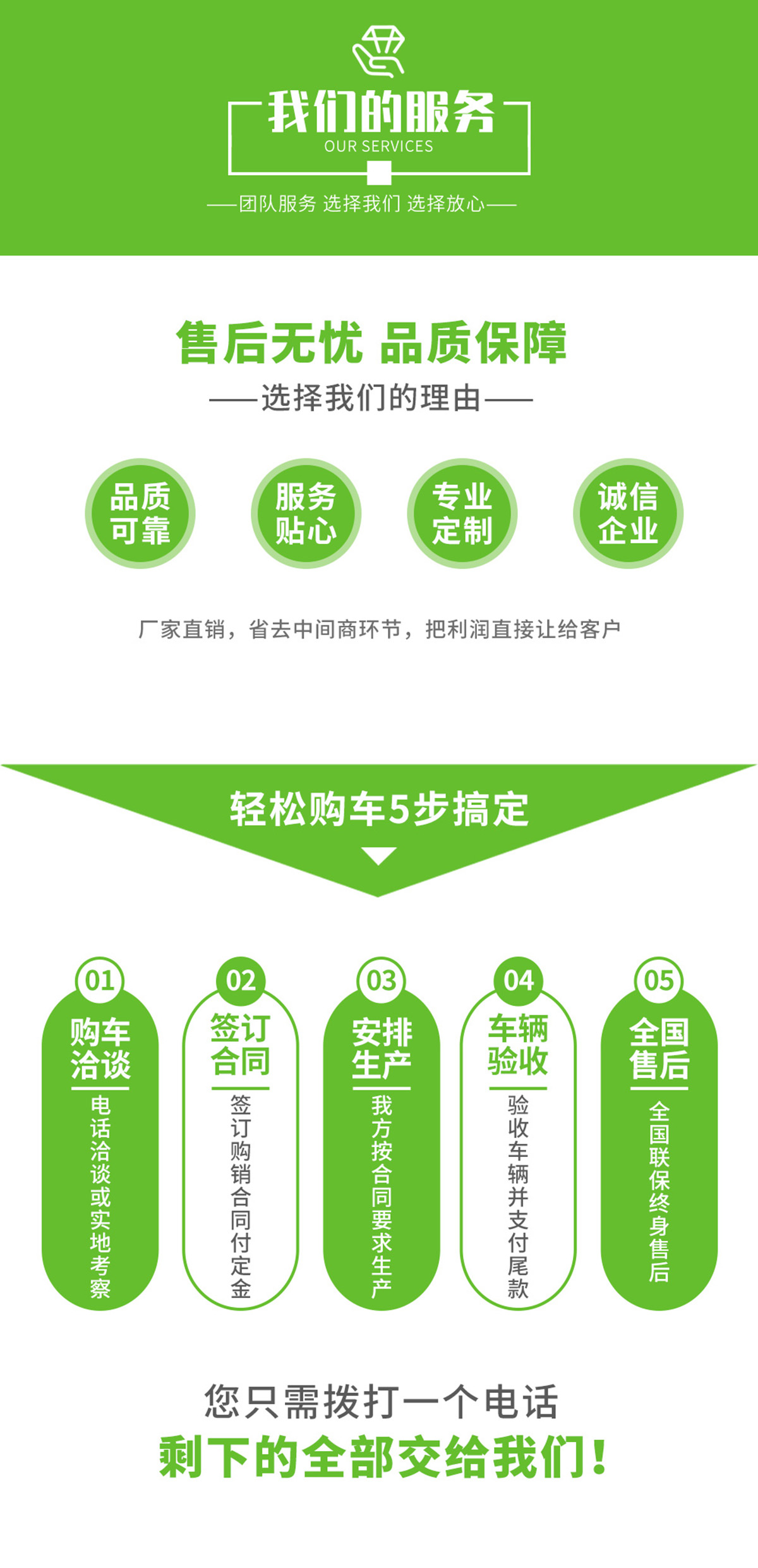 ·創(chuàng)優(yōu)質(zhì)服務(wù)企業(yè); 造用戶滿意產(chǎn)品; 樹國內(nèi)知名品牌!公司堅(jiān)持以“質(zhì)量求生存、信譽(yù)求發(fā)展、科技創(chuàng)新路、服務(wù)創(chuàng)品牌”的經(jīng)營理念,以“誠信、務(wù)實(shí)、創(chuàng)新、進(jìn)取”為企業(yè)宗旨,不斷提升自身產(chǎn)品質(zhì)量,開發(fā)適應(yīng)市場需求物美價廉的多功能專用汽車! 我們將謁誠為您提供更好、更快、更優(yōu)質(zhì)的服務(wù)!